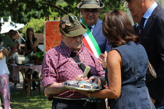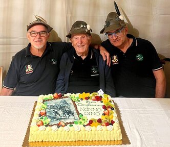 Il socio Frare Eugenio, classe 1935, Brigata Alpina Julia, 8° Reggimento Alpini, Comando Tolmezzo nel giorno del suo 90° compleanno; auguri da parte di tutto il Gruppo